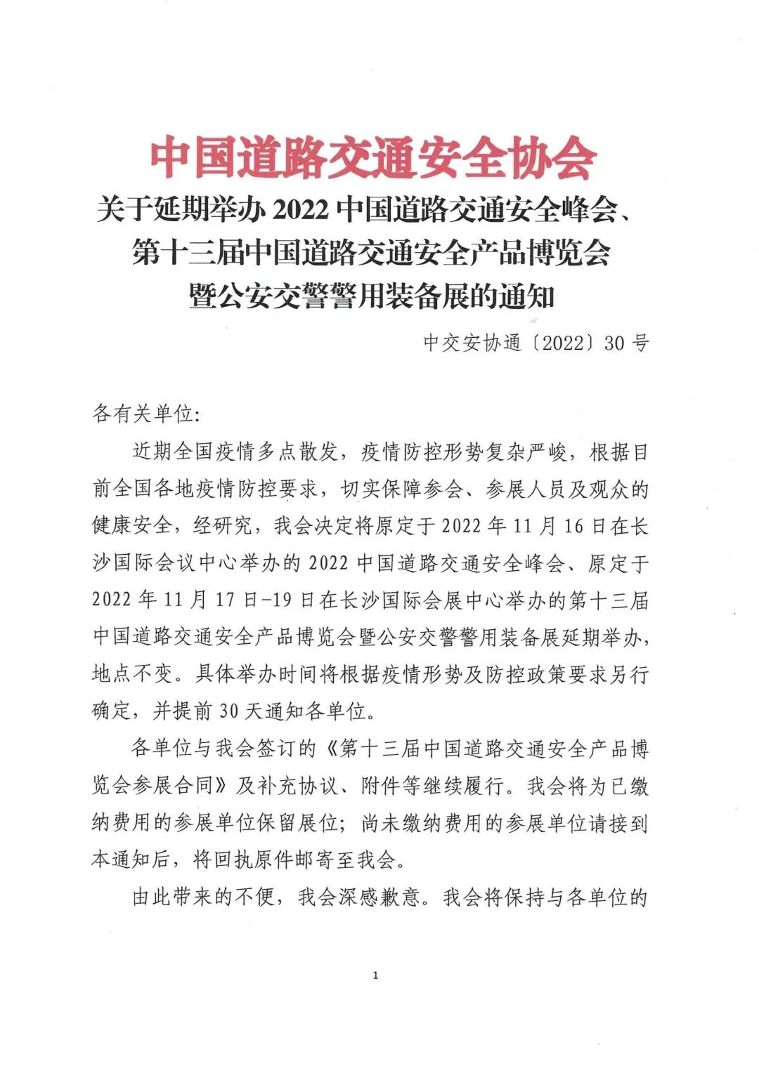 2022中國道路交通安全峰會、第十三屆中國道路交通安全產(chǎn)品博覽會暨公安交警警用裝備展延期通知